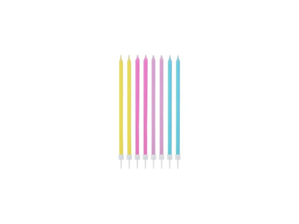 Tortové sviečky dlhé v pastelových farbách s držadlami pre bezproblémové upevnenie na tortu. Urobia radosť každému oslávencovi, nielen deťom. Rozmer: 14,5 x 0,6 cm Balenie: 16 ks.